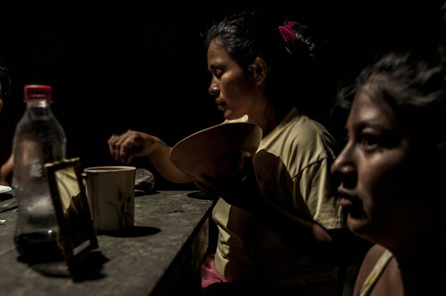 Las mujeres se reúnen en el centro de las casas de los anfitriones para contar las presas de carne que han sido cazadas y para prepararlas, ya que serán la fuente de comida para los días de fiesta. |