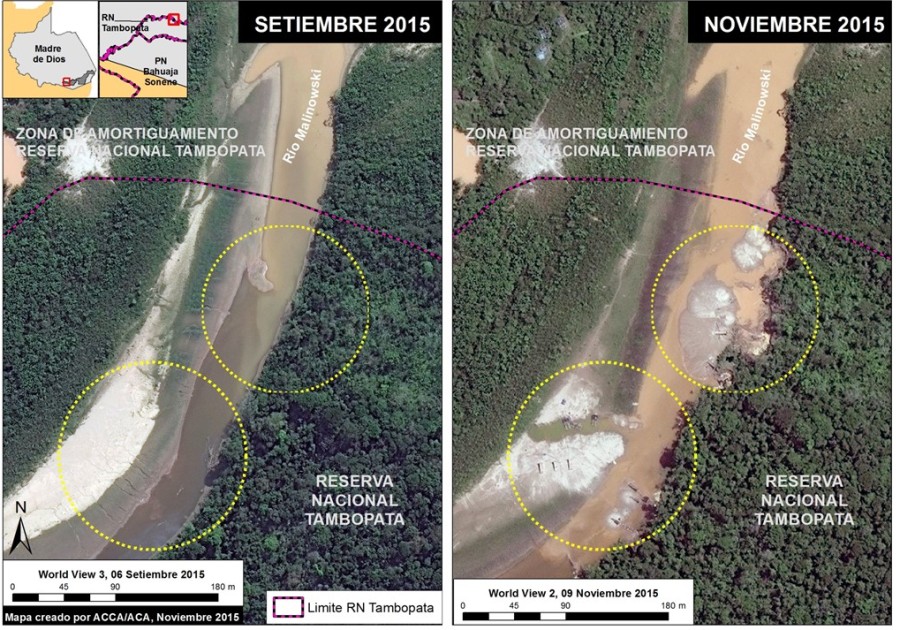 Informes del Proyecto de Monitoreo de la Amazonía Andina (MAAP) utilizados en este estudio dan cuenta de cómo esta actividad ilegal ingresó a la reserva a partir del año 2015. A través de imágenes satelitales se observa cómo en setiembre de ese año el territorio no había sido afectado y solo dos meses después ya mostraba zonas deforestadas dentro de la reserva causadas por minería ilegal. Otro análisis de MAAP presentado en abril del año pasado indica que la deforestación causada por la minería entre enero de 2017 y febrero de 2018 fue de 1320 hectáreas, en las áreas de La Pampa (sector Balata), Alto Malinowski y en la Reserva Nacional Tambopata.